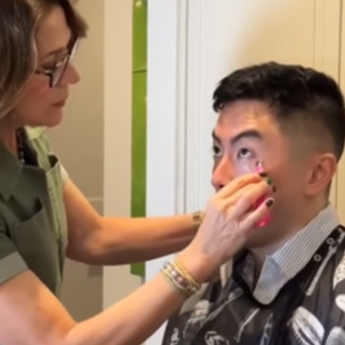 The standout of this product, in my book, was the cooling metal tip applicator. I'll definitely be packing it in my travel beauty bag, as it eliminates the need for an ice roller if you need a cooling effect on eyes fresh out of the shower. You can see how that works below, with groomer and makeup artist Evy Drew applying the product to Yang's face.