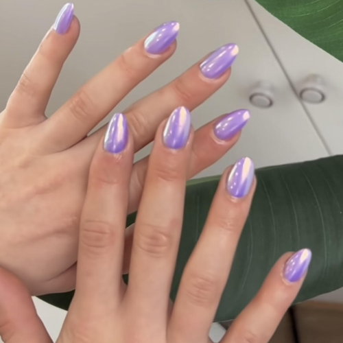 A picture is always your best bet for showing your nail technician exactly what you want, but here's the general gist. Ask for icy lavender polish with a touch of shimmer within, to then be topped with the same chrome dust that Hailey Bieber's OG look featured, just in a dreamy purple hue instead.