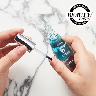 She then follows this with two coats of her selected nail colour (like Debicki's 'Society Ruler') and allows the nail colour to dry for five to seven minutes before she applies the Sally Hansen Insta Dry Top Coat ($15.95 at Priceline).
