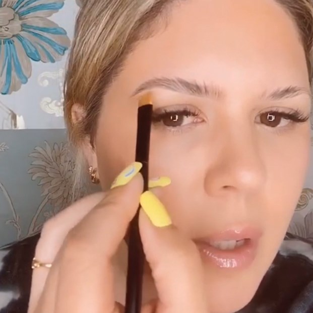 “First you’re going to use a highlighter pencil – take a little swipe of the top [on an angled brush and apply it] right underneath the brow,” she explains of the technique. “[Work the illuminator] straight across, and then turn [at your arch] and go down. We’re basically making our own stencil [before we] fill in above that area.”