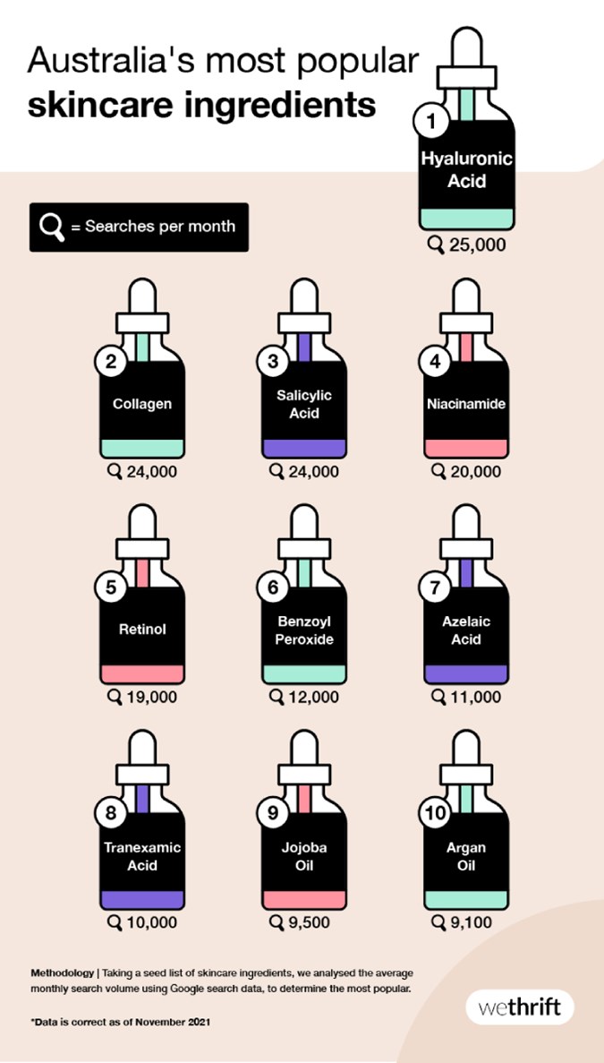 At least, that’s what shopping aficionados WeThrift found out when they pulled a recent Google Search report which tallied the 10 most searched skin care ingredients in Australia.