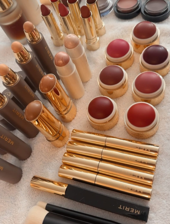Then she laid down her base: "Merit Minimalist Complexion Stick in 'Sand' and 'Bisque' ($63 from Merit Beauty) buffed together into skin using Merit's Blending Brush No. 1 ($52 from Merit Beauty), Merit Bronze Balm in ‘Clay’ ($52 from Merit Beauty) to the parameters of the face and contour, [and] Merit Flush Balm in ‘Bespoke’ ($48 from Merit Beauty) to the cheeks."