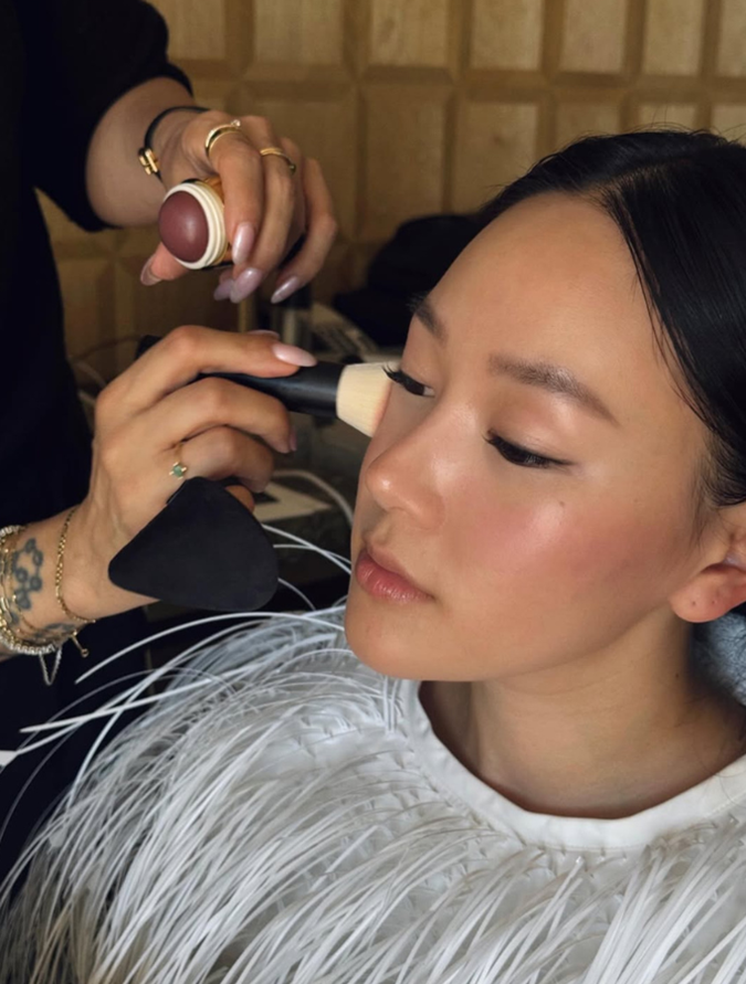 “For tonight, the focus was radiant, expensive-looking skin," Yerin Ha's makeup artist, Misha Shahzada explains. "I used Merit Beauty’s cream-based formulas throughout — complexion, blush, and eyes — so everything feels cohesive and melts into the skin."